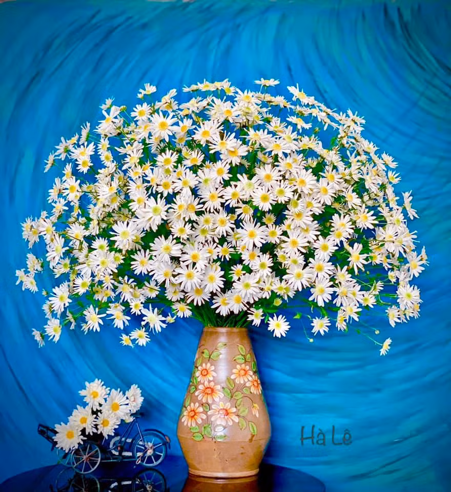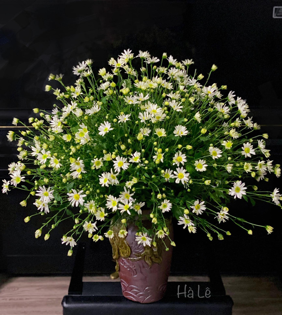 "Mình thích cúc họa mi Nhật Tân vì hoa thơm, nở to, cánh tròn, nhuỵ xanh, thân cành mảnh nhưng những cành chính vẫn đủ độ cứng để cắm trung tâm, những cành xung quanh lại mềm rủ tách ra cắm lọ hoa được mềm mại. Đặc biệt hoa rất bền, có khi thời tiết lạnh ẩm chơi hoa độ bền đến nửa tháng" - Hà Lê chia sẻ.