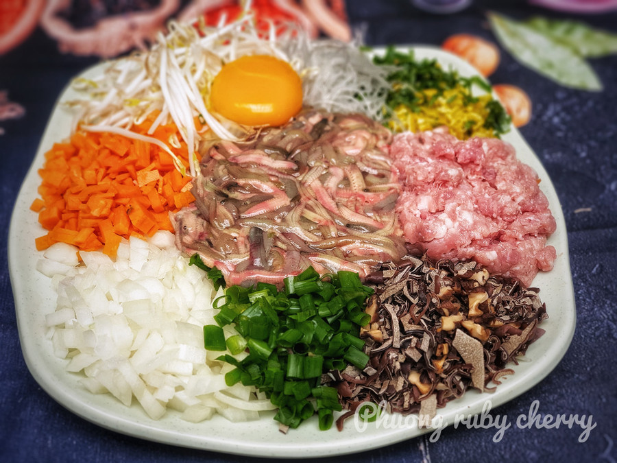 Cho hành, thì là, lá gừng, thịt xay, trứng gà, gia vị, hạt tiêu, ớt bột vào đánh đều cùng rươi.