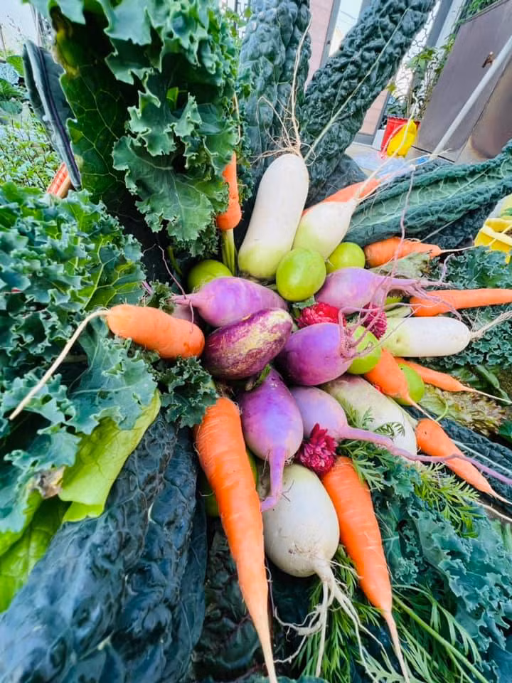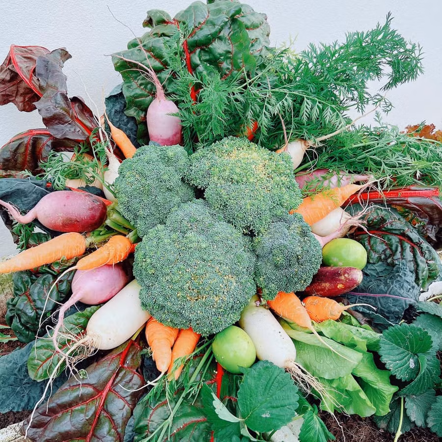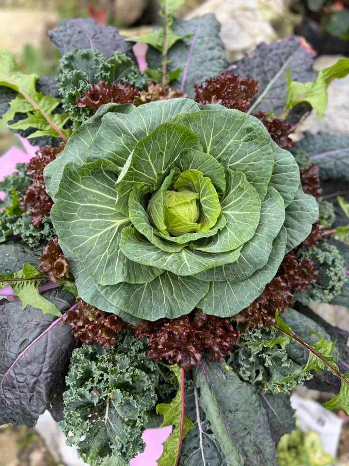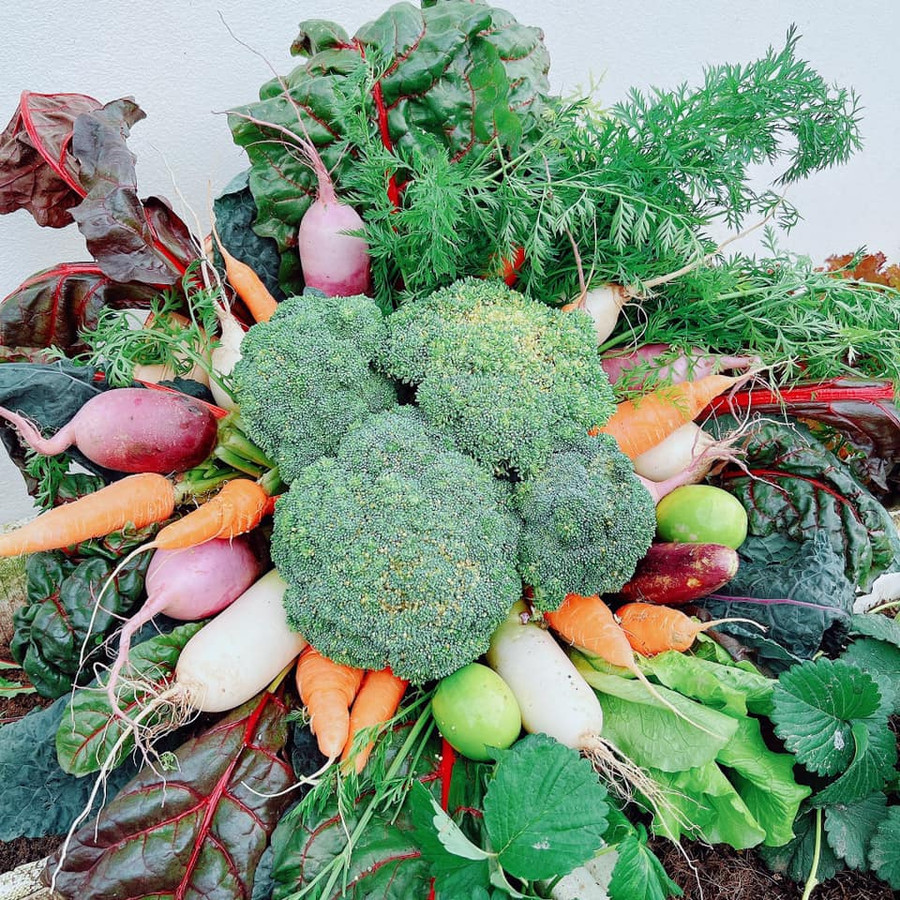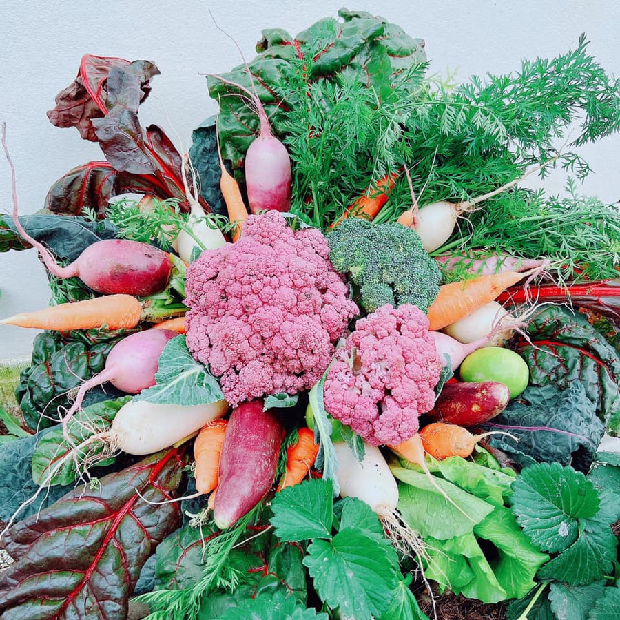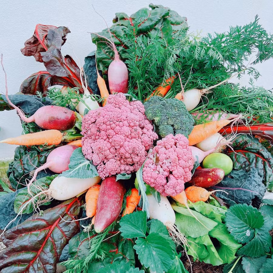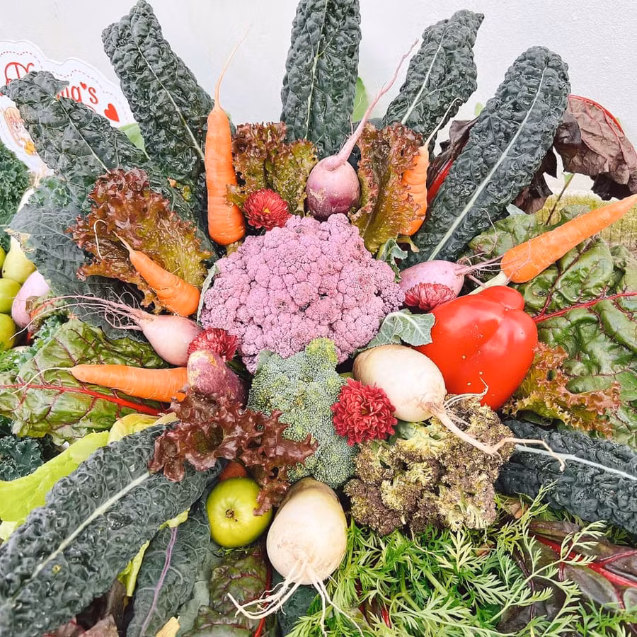 | Bó rau củ từ súp lơ tím, củ cải Hàn, cà rốt, ớt chuông, lá cải cầu vồng, kale. |