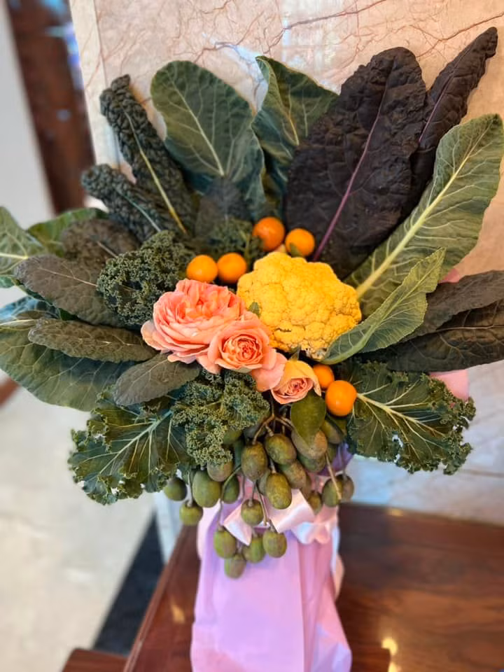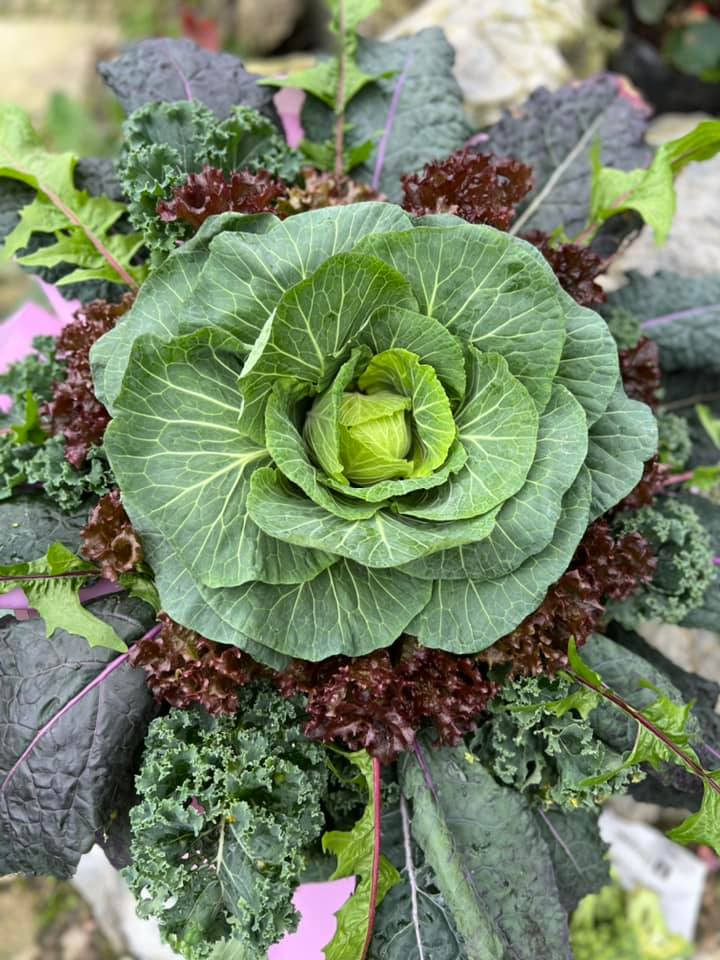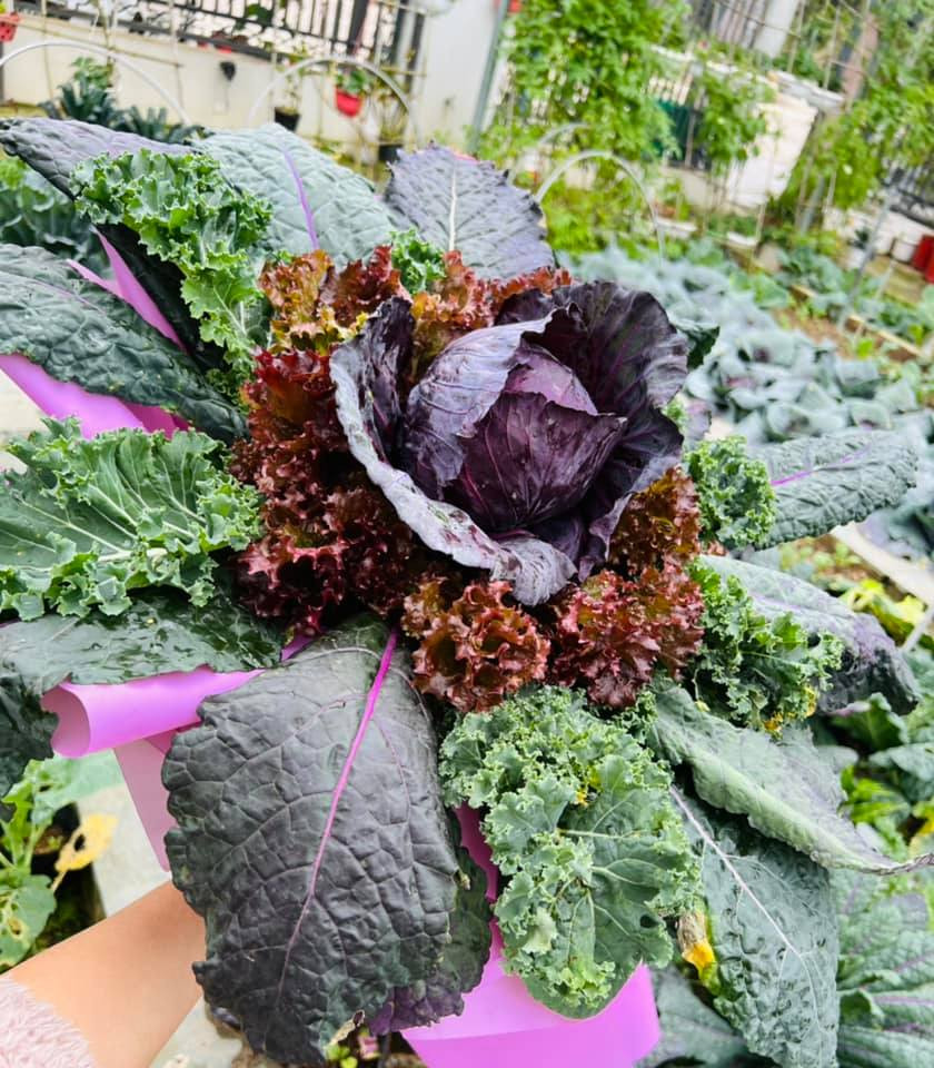 | Bó hoa từ hoa súp lơ và lá cải kale và rau xà lách. |