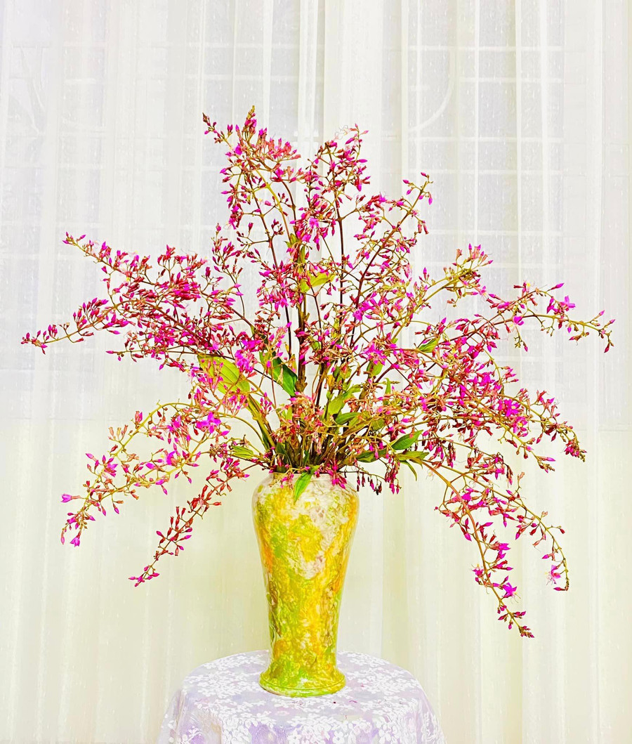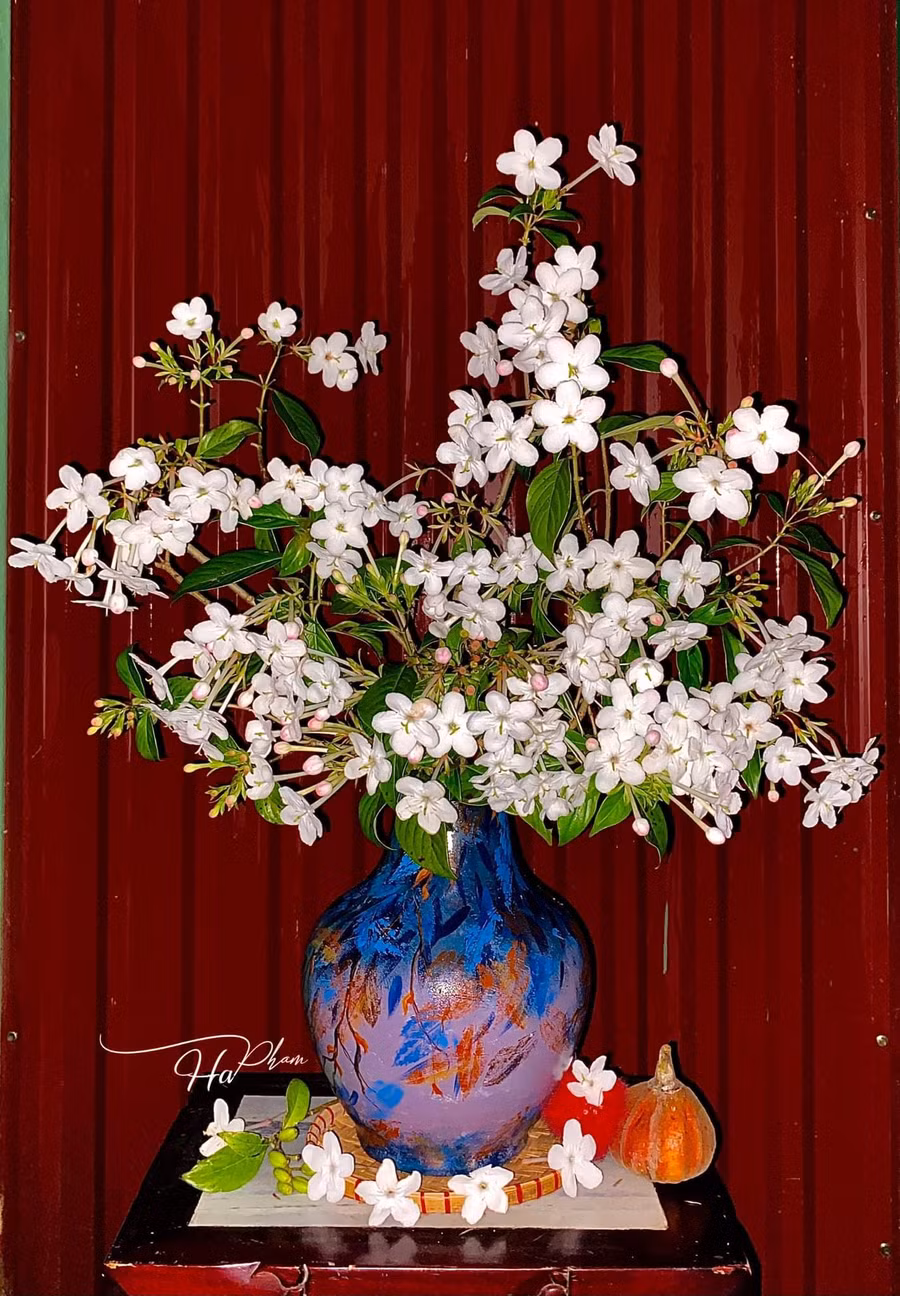 Chị Hà chia sẻ rằng, cứ dành tất cả niềm đam mê và tâm huyết vào những bình hoa mà mình cắm, chắc chắn khi ngắm nhìn thành quả, bạn sẽ cảm thấy yêu đời, yêu cuộc sống và yêu chính mình nhiều hơn. Nhiều chị em còn nhanh chóng xin bí quyết để trổ tài cắm cành quả đẹp như vậy.