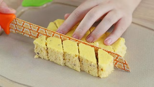 Cắt bánh thành từng miếng nhỏ cho bé dùng.