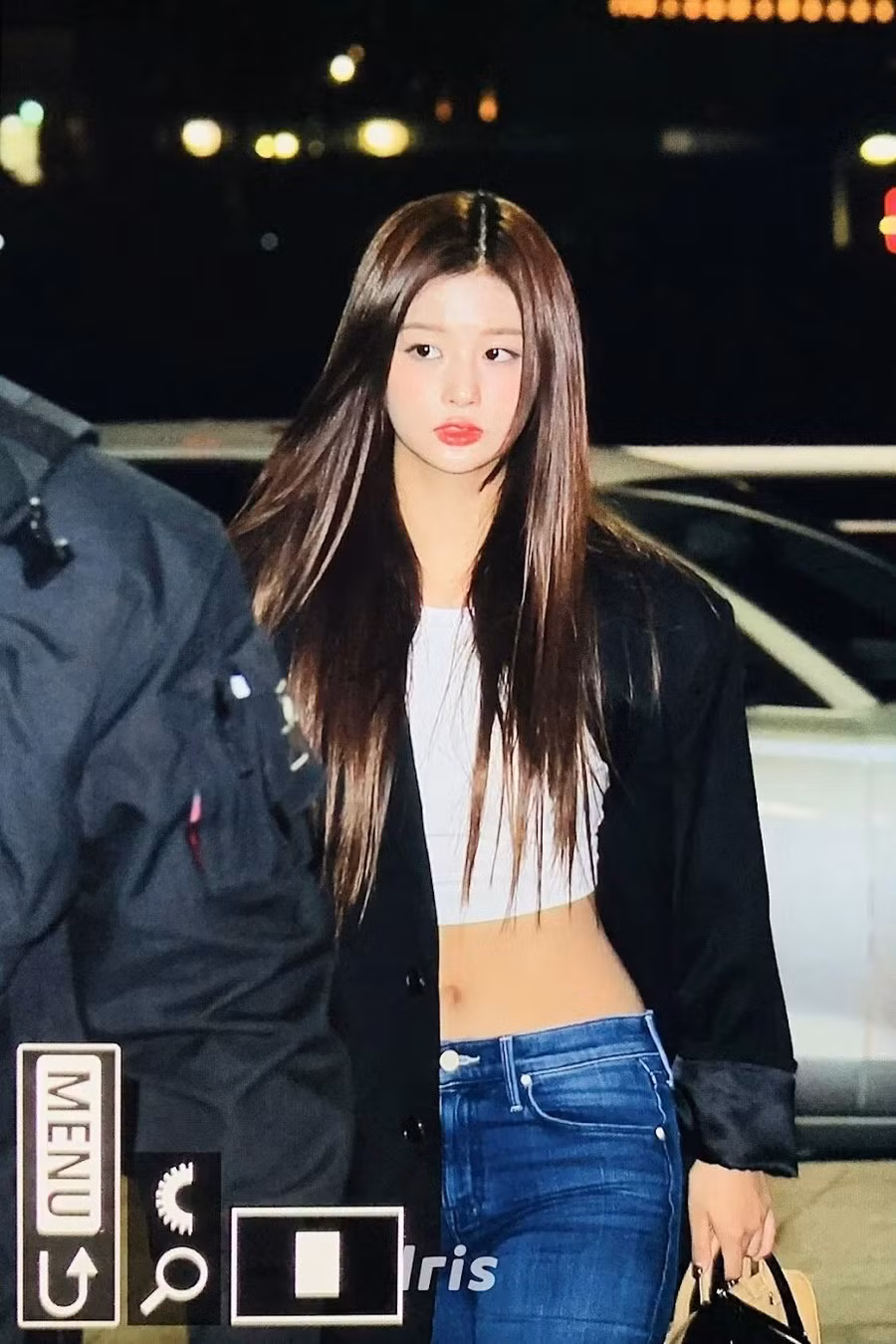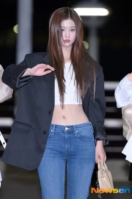Sullyoon của NMIXX để lộ thân hình "đồng hồ cát" trong chiếc áo crop top trắng đơn giản và quần jean cạp trễ.