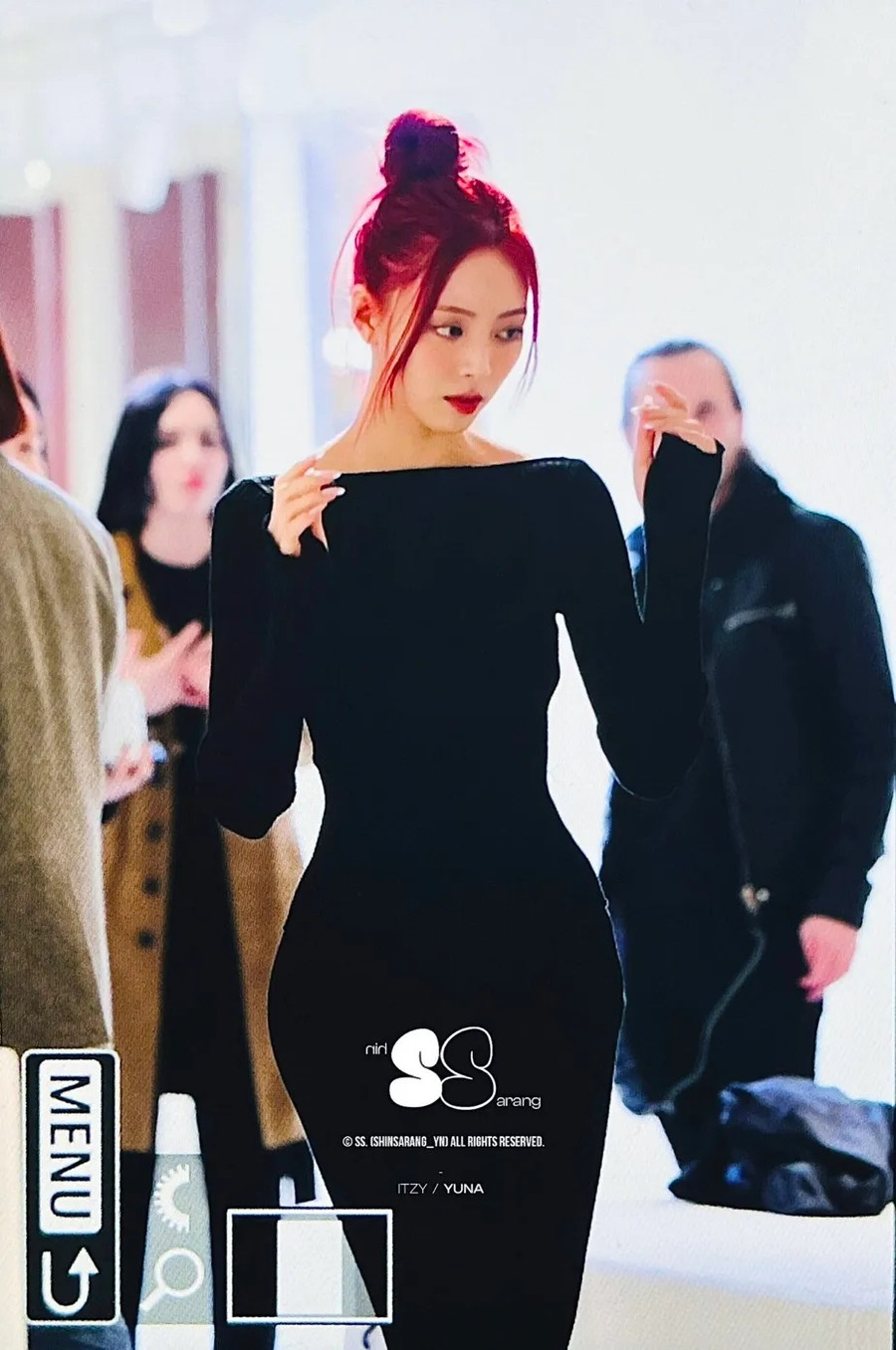 Yuna của ITZY khiến fan choáng váng khi diện váy len bodycon màu đen ở Paris. Kiểu dáng bó sát tôn lên vóc dáng của cô trong khi kiểu tóc cập nhật giúp hình ảnh của cô tỏa sáng.