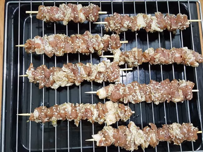 – Bật sẵn lò 200 độ C, xếp các xiên thịt vào khay nướng, để ngăn đầu tiên và nướng trong khoảng 20 phút.