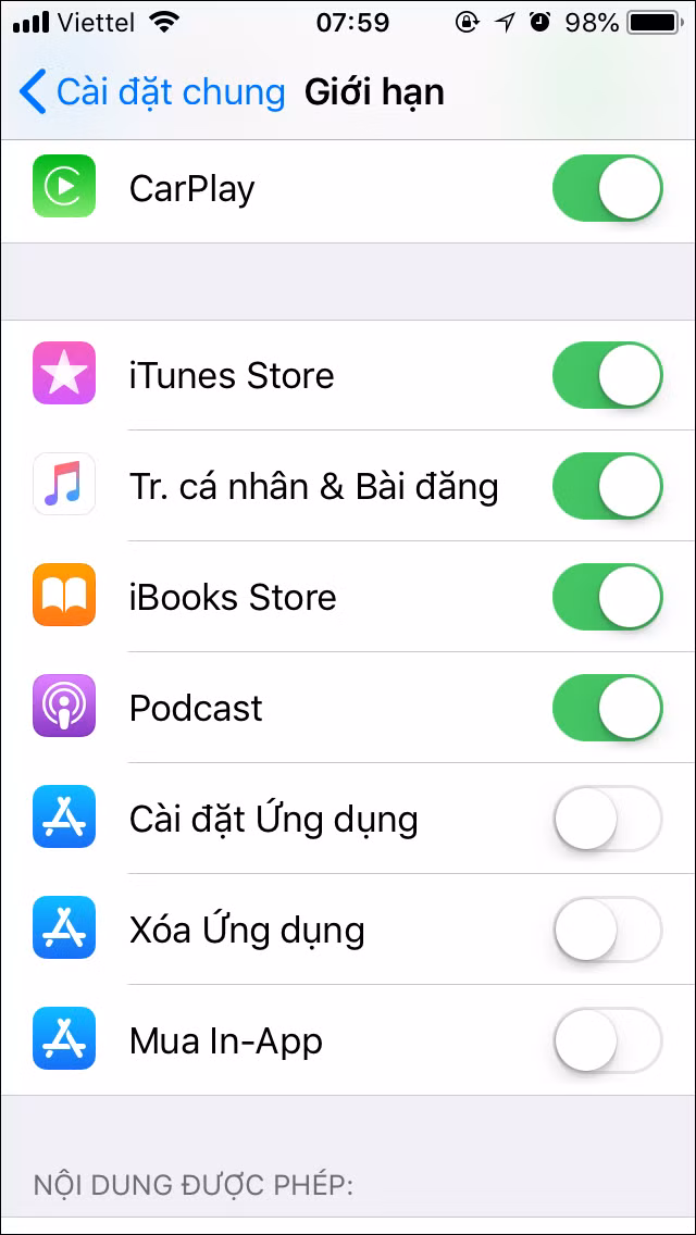 Cuối cùng, để cấm người khác mua thêm tính năng trên ứng dụng, game, bạn chuyển công tắc In-App Purchases (Mua In-App) sang vị trí OFF (Tắt).