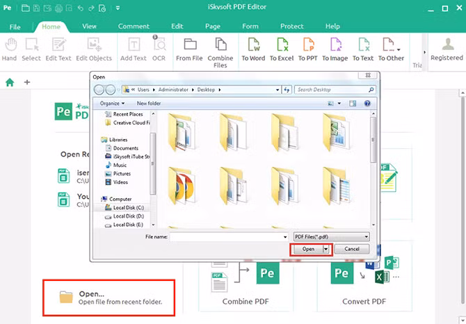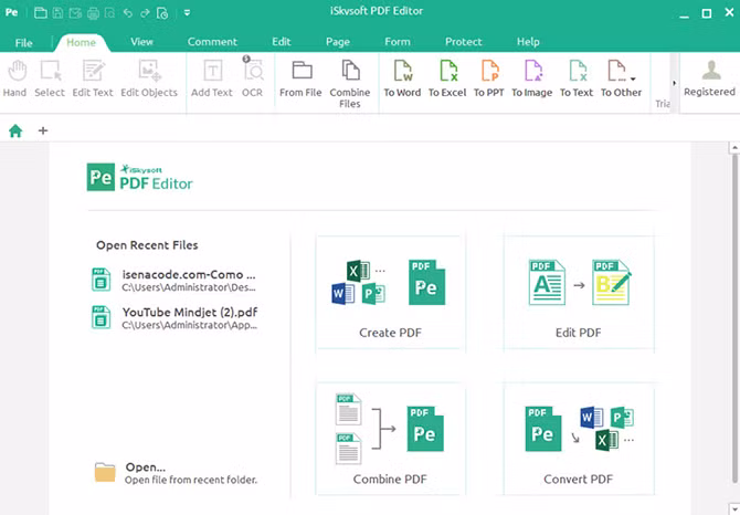 Phần mềm PDF Editor tương thích với mọi máy tính chạy hệ điều hành Windows và Mac. Sau khi tải về khởi chạy, giao diện PDF Editor sẽ xuất hiện với 4 lựa chọn chính: Create PDF (tạo PDF), Edit PDF Text (chỉnh sửa PDF), Combine PDF (kết hợp PDF) và Convert PDF (chuyển đổi PDF). Bạn click vào nút Open và chọn tập tin PDF của bạn để chỉnh sửa. Bạn cũng có thể mở tài liệu PDF bằng cách kéo/thả vào phần mềm.