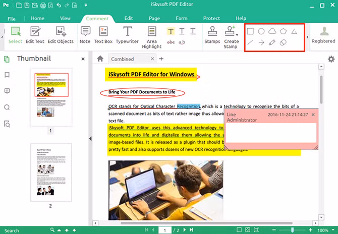 Chú thích trên điển nhấn/nội dung quan trọng, cho phép bạn tìm thấy những nội dung quan trọng trên tài liệu PDF sau này. Các công cụ này bao gồm đánh dấu, gạch dưới, gạch ngang, đánh dấu, hộp văn bản, hình chữ nhật, công cụ đám mây…
