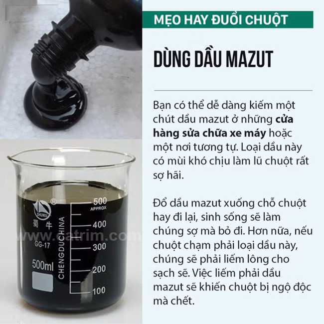 Đổ dầu mazut xuống chỗ chuột hay đi lại, sinh sống sẽ làm chúng sợ mà bỏ đi. Hơn nữa, nếu chuột chạm phải loại dầu này, chúng sẽ phải liếm lông cho sạch sẽ. Việc liếm phải dầu mazut sẽ khiến chuột bị ngộ độc mà chết.