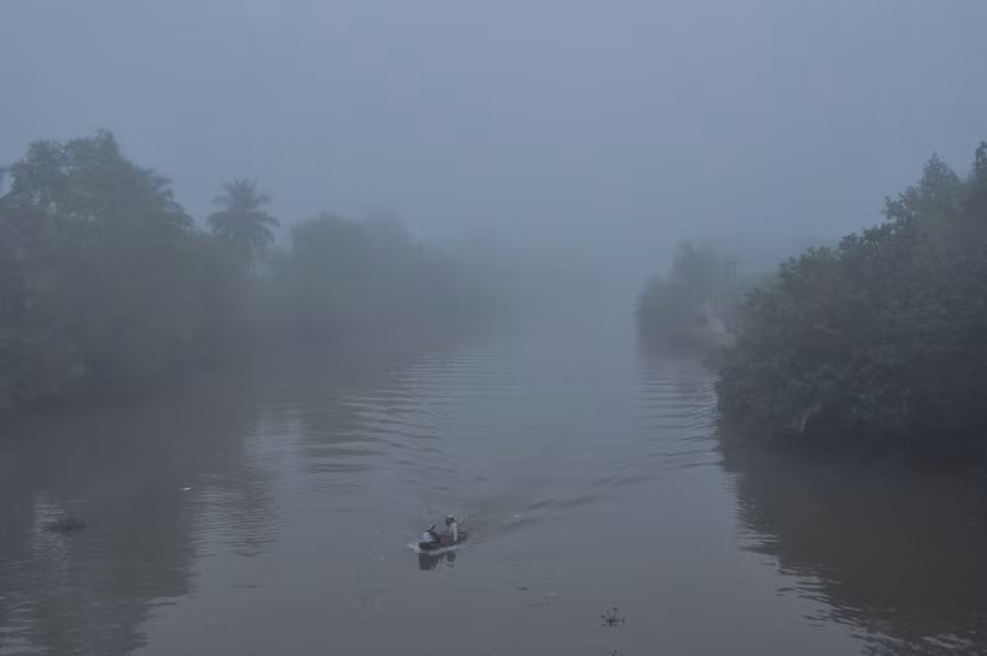 Tại tỉnh Vĩnh Long vào sáng nay sương mù cũng xuất hiện trên khắp cánh đồng và đường phố gây khó khăn cho người đi đường.