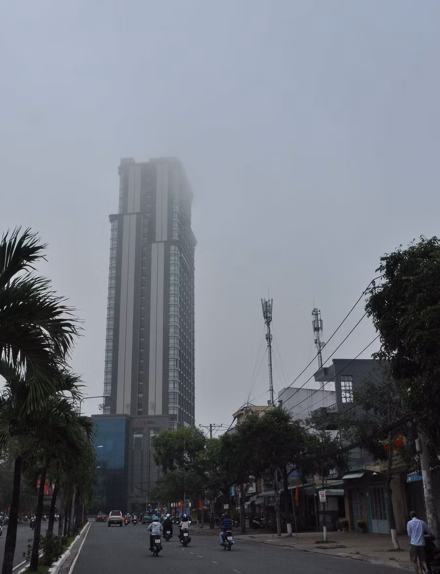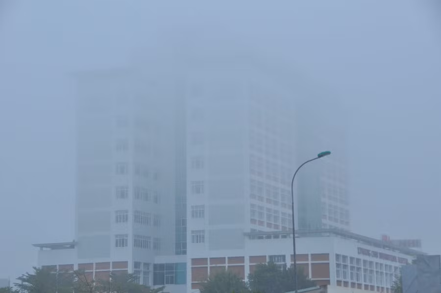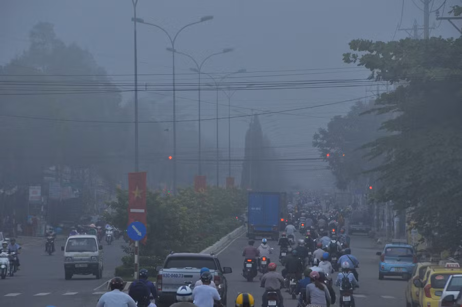Khoảng từ 6 giờ đến 7 giờ 30 phút, do sương mù phủ xuống làm giảm tầm nhìn nên người dân chạy xe gắn máy phải bật đèn.