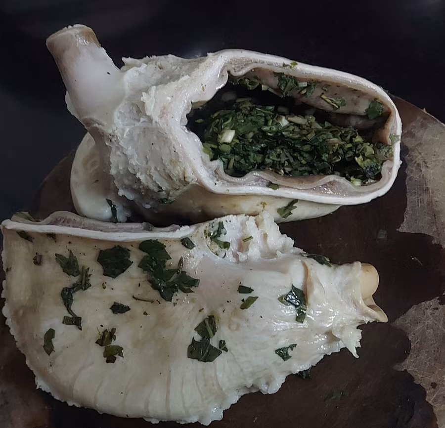 Vậy là, sáng Chủ nhật cả nhà lại rộn ràng với món dạ dày hấp. Sau phần sơ chế cẩn thận rồi thái nhỏ rau thơm trộn hạt tiêu, bột canh và nhồi vào giữa dạ dày của mấy bố con, mẹ sẽ đảm nhiệm việc hấp.