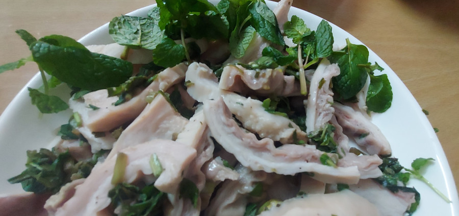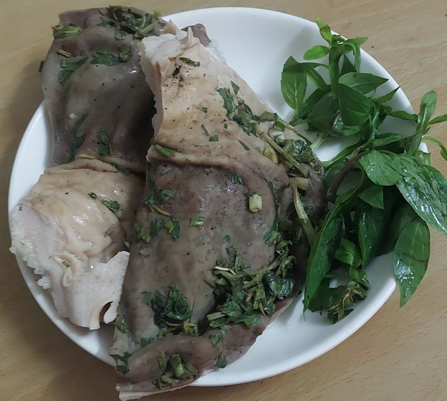 Mỗi lần thấy mẹ đi chợ về và cất tiếng gọi, bố liền tủm tỉm cười mà rằng: “Nay bố con ta lại được “miệng nhai, tai nghe”. Nào, mỗi đứa giúp một tay. Hai đứa nhặt rau thơm (húng quế, ngổ, hành hoa, rau răm) còn bố sẽ làm sạch cái dạ dày này. Chà, sẽ giòn lắm đây vì mẹ mua được hàng tươi ngon!”.