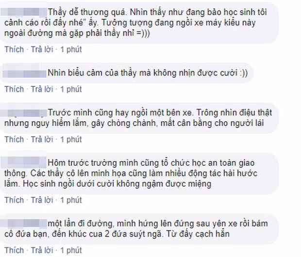 "Thầy dễ thương quá. Nhìn thấy như đang bảo học sinh: "Tôi cảnh cáo rồi đấy nhé". Tưởng tượng đang ngồi xe máy kiểu này ngoài đường mà gặp phải thầy nhỉ".