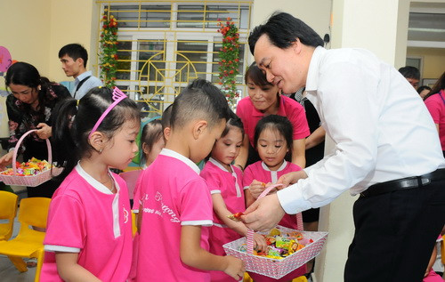 Đến thăm Trường Mầm non Hoa Phượng, Bộ trưởng đã tặng quà Trung Thu cho trẻ và rất vui mừng khi thấy trẻ em của trường rất mạnh dạn tự tin trong giao tiếp chứng tỏ các cháu đã được nuôi dạy rất chu đáo