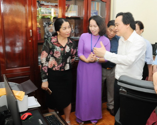 Bộ trưởng Phùng Xuân Nhạ quan tâm hỏi han rất nhiều về ứng dụng CNTT có tác động như thế nào đến công tác quản lý, tổ chức dạy và học. Việc trang bị các phòng học thông minh, thiết bị tương tác thông cho học sinh của nhà trường đã giúp cải thiện chất lượng dạy và học như thế nào, Hiệu trưởng giám sát nền nếp học tập đến từng lớp học có tạo sức ép cho giáo viên hay không