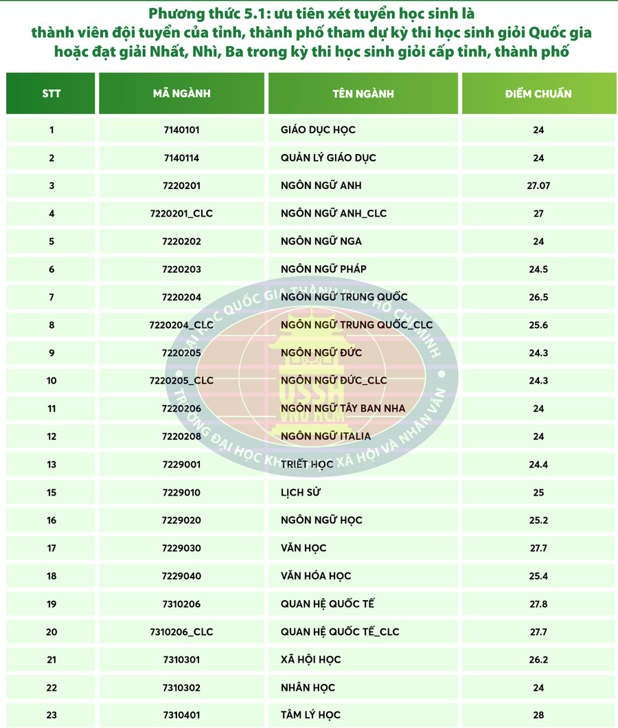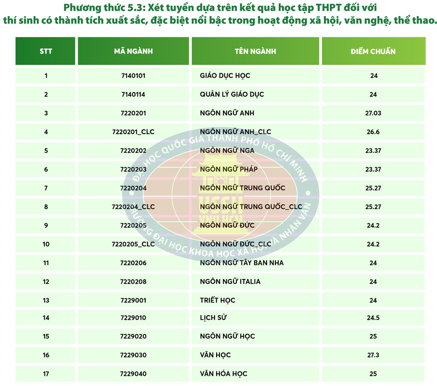 Ngoài ra, Trường ĐH Khoa học xã hội và Nhân văn còn công bố điểm trúng tuyển có điều kiện phương thức ưu tiên xét tuyển học sinh là thành viên đội tuyển của tỉnh, thành phố tham dự kỳ thi học sinh giỏi Quốc gia hoặc đạt giải Nhất, Nhì, Ba trong kỳ thi học sinh giỏi cấp tỉnh/thành phố (phương thức 5.1); xét tuyển dựa trên kết quả học tập THPT đối với thí sinh có thành tích xuất sắc, đặc biệt nổi bật trong hoạt động xã hội, văn nghệ, thể thao (phương thức 5.3).