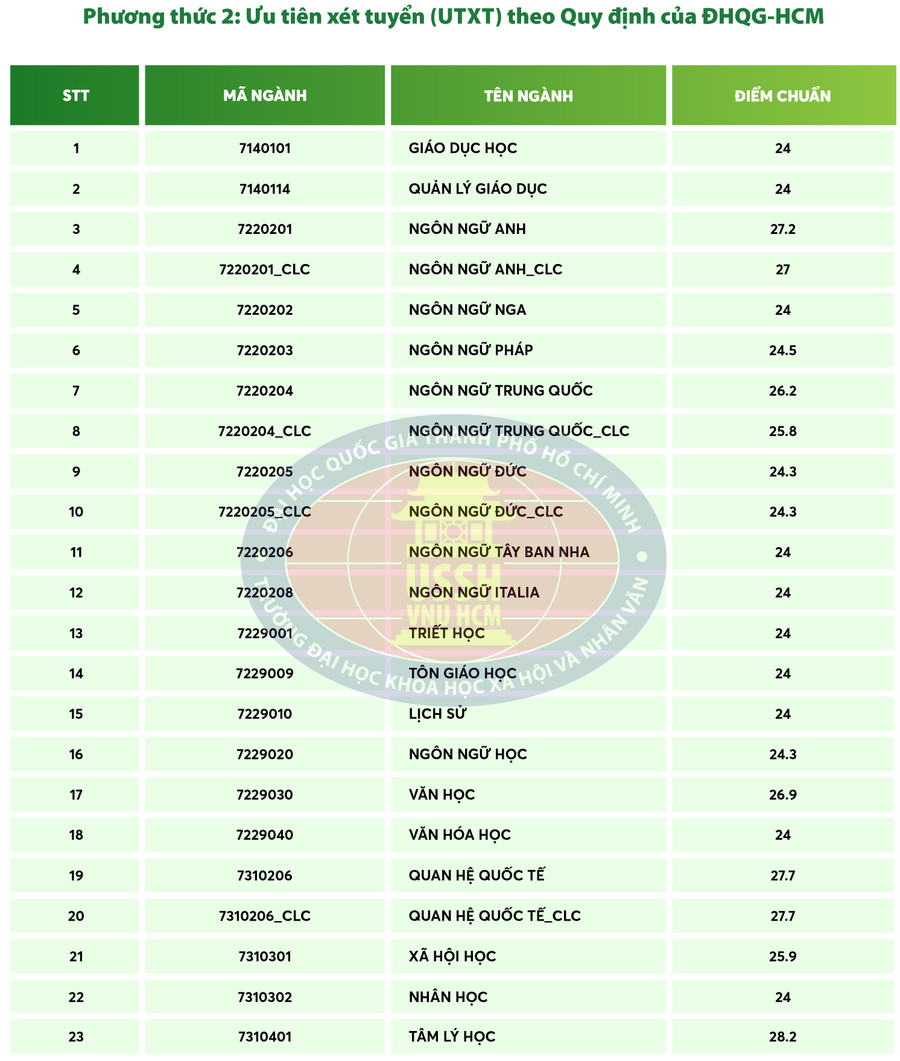 Thứ hai, điểm chuẩn phương thức ưu tiên xét tuyển theo quy định của ĐHQG TPHCM (phương thức 2):