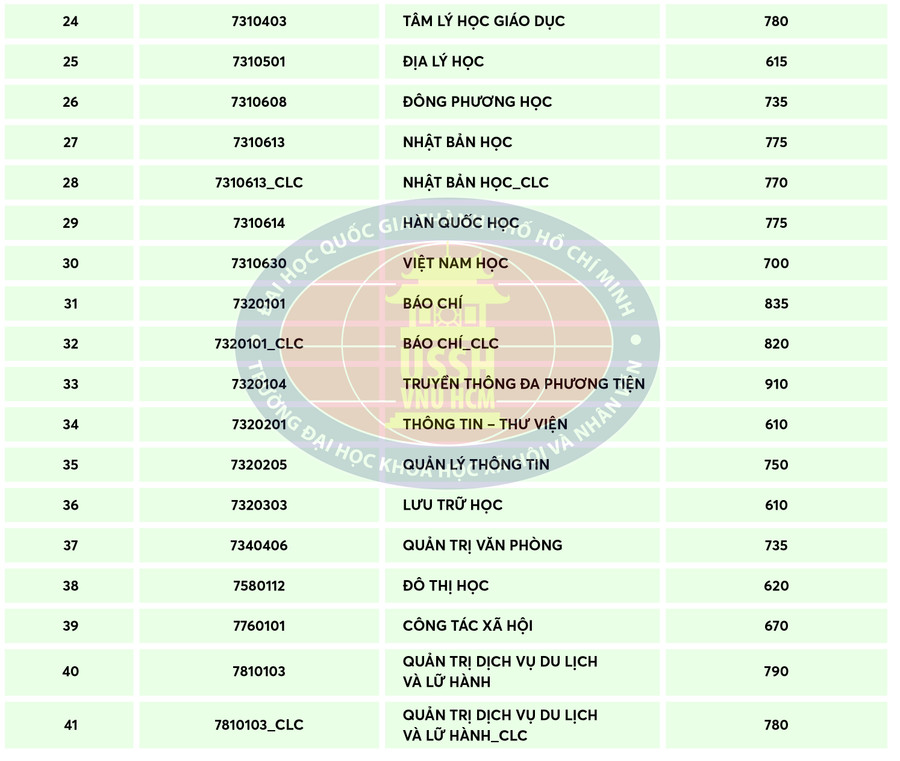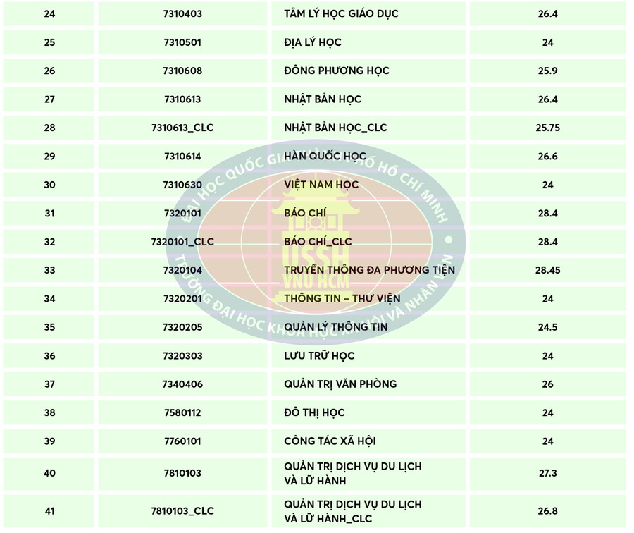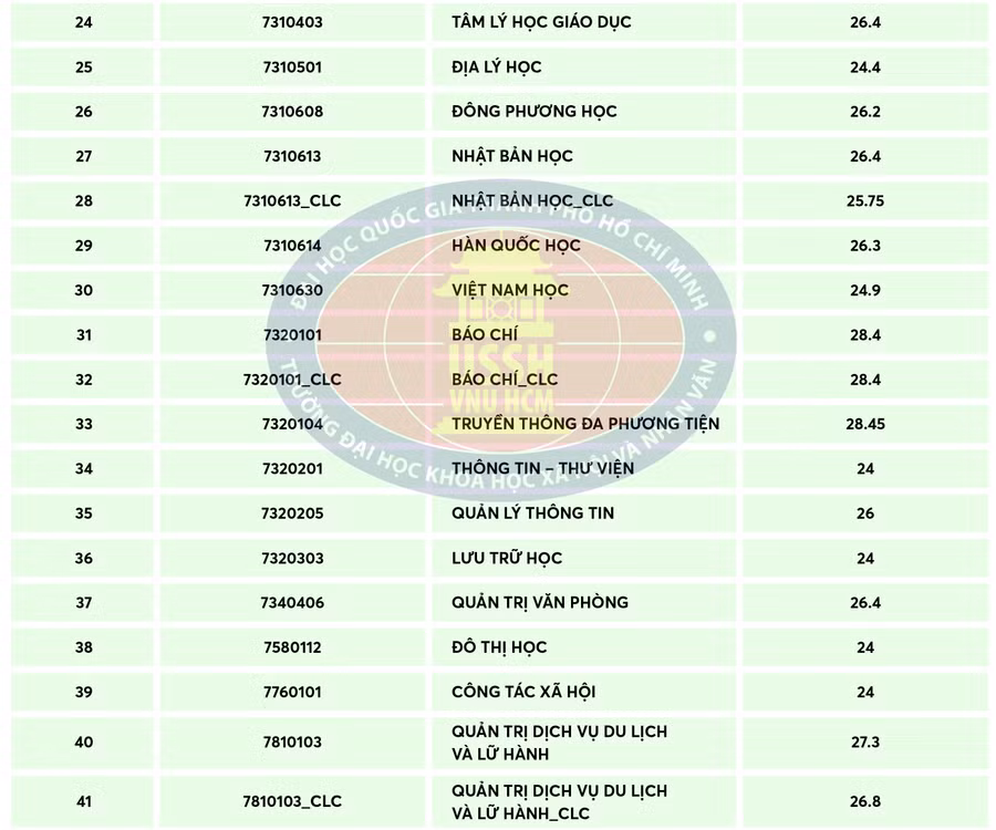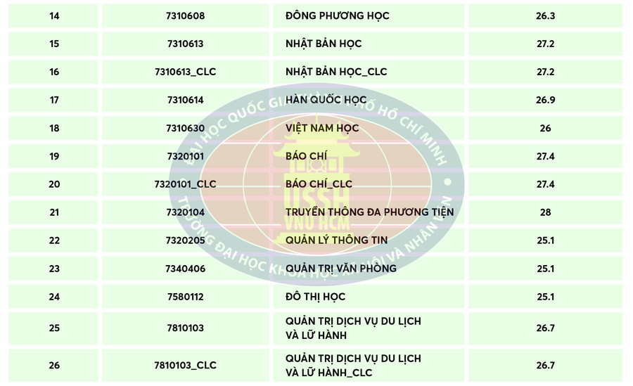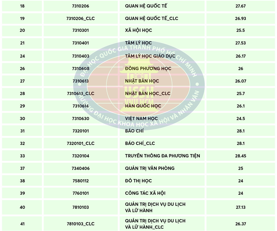 Năm nay, điểm chuẩn trúng tuyển có điều kiện của phương thức ưu tiên xét tuyển theo quy định của ĐHQG TPHCM dao động 24-28,45 điểm. Trong đó, nhóm các mã ngành có điểm từ 27 gồm: Truyền thông đa phương tiện, Báo chí, Tâm lý học , Quan hệ quốc tế, Quản trị dịch vụ du lịch và lữ hành...