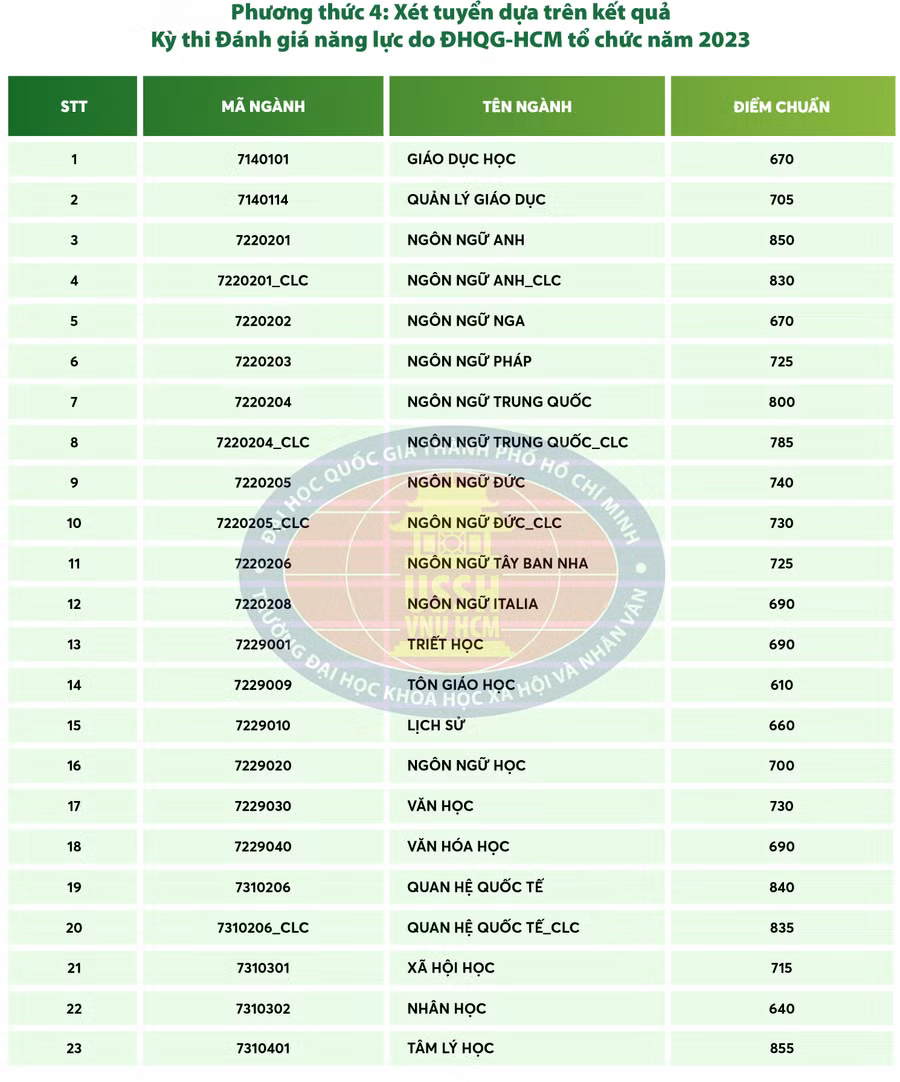 Thứ ba, với phương thức xét tuyển dựa trên kết quả kỳ thi đánh giá năng lực do ĐHQG TPHCM tổ chức (phương thức 4), điểm chuẩn trúng tuyển dao động từ 610-910 điểm.