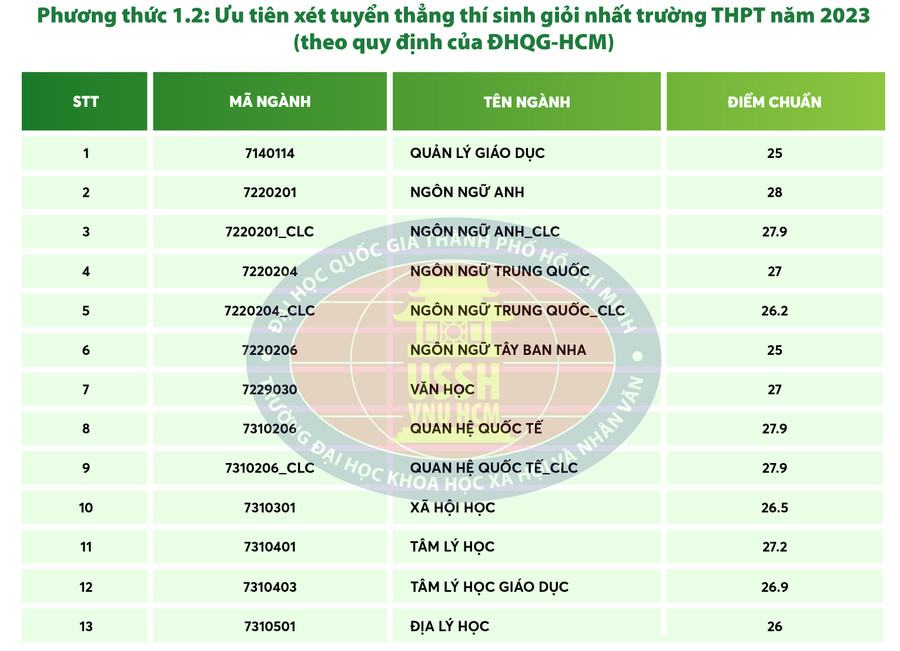 Thứ nhất, phương thức ưu tiên xét tuyển thẳng thí sinh giỏi nhất trường THPT năm 2023 theo quy định của ĐHQG TPHCM (gọi là phương thức 1.2).