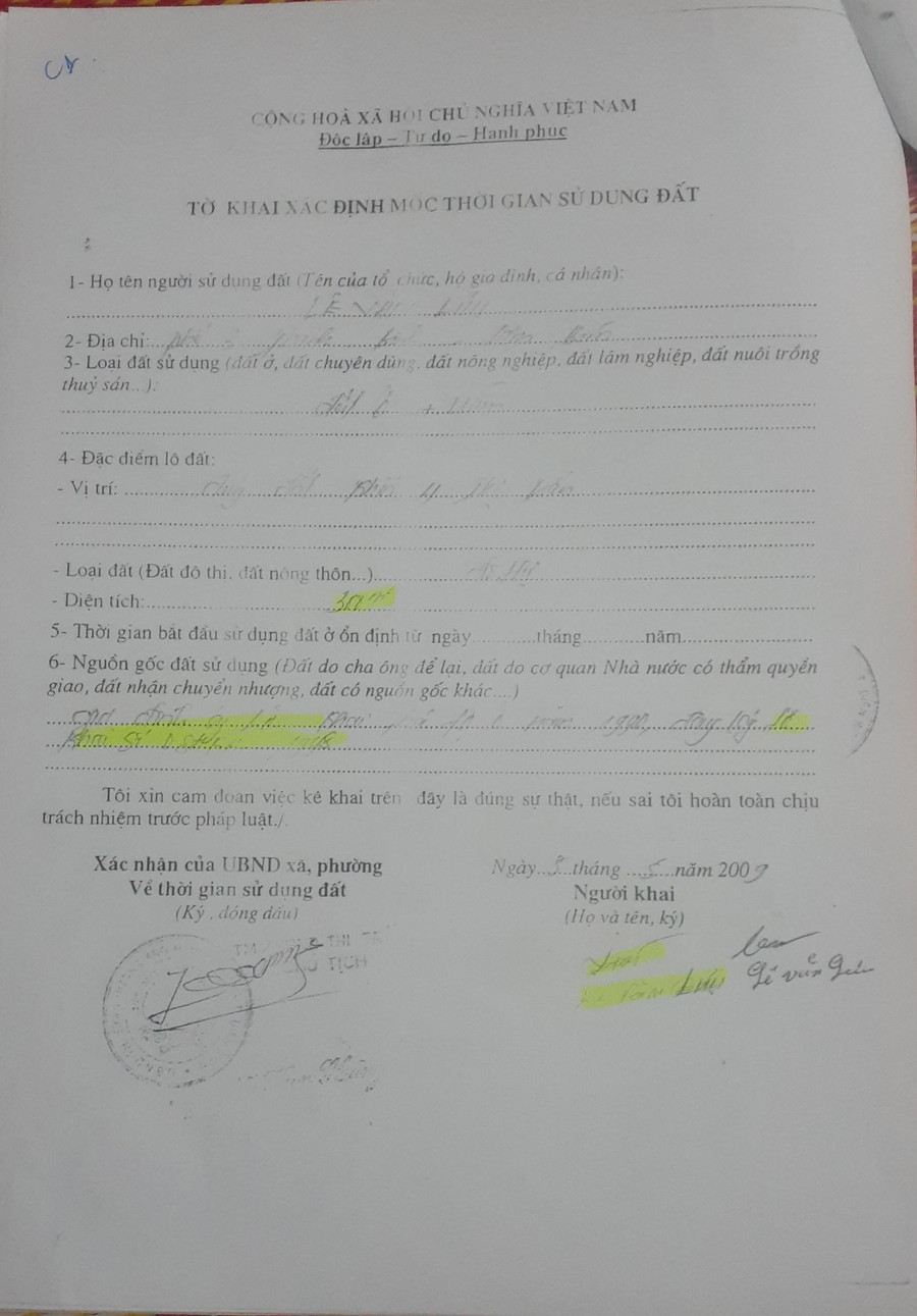 Trong khi, tại tờ khai xác định mốc thời gian sử dụng đất (ngày 5/5/2009), ông Lưu kê khai 300m2 đất xin cấp lần này có nguồn gốc: “Gia đình ông Lưu khai phá tự ở năm 1990, đăng ký tờ khai số 084-k4, 1998”. Nội dung này đã thể hiện tại tờ khai xác định mốc thời gian sử dụng đất (với thửa số 48, tờ bản đồ số 10) do ông Đại lập cùng ngày 5/5/2009.