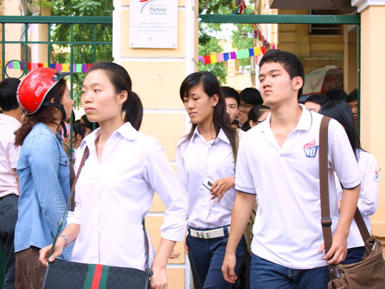 Bước vào môn thi đầu tiên, không ít thi sinh có cùng tâm trạng hồi hộp, lo lắng. (Ảnh chụp tại điểm thi trường THPT Trần Phú, quận Hoàn Kiếm, HN trước giờ thi môn Ngữ văn, ngày 2/6)