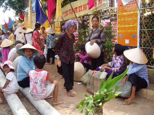 Sáng ngày 06/05 (tức ngày 16/04 ÂL) trời mới tờ mờ sáng, mặc dù chưa đến buổi lễ nhưng chúng tôi đã bắt gặp nhiều trẻ con cùng người già trên tay cầm bọc ni lông hay giỏ, túi để chuẩn bị nhận gạo vì họ cho biết mỗi năm chỉ chờ có một ngày này nên khi nghe nhà chùa phát gạo là chỉ mong cho trời mau sáng để đến đây.
