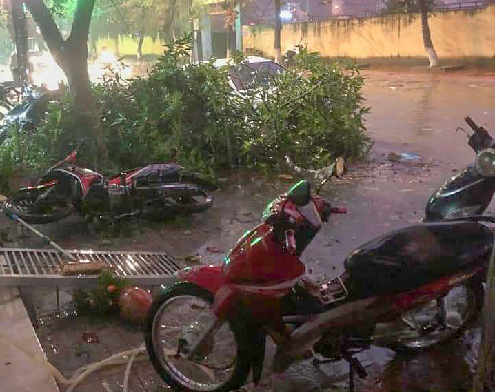 | Mưa đá kèm theo giông lốc khiến nhiều cây cối gẫy đổ, tài sản người dân hư hại. |