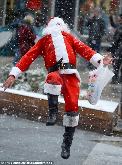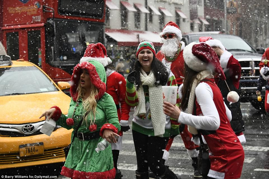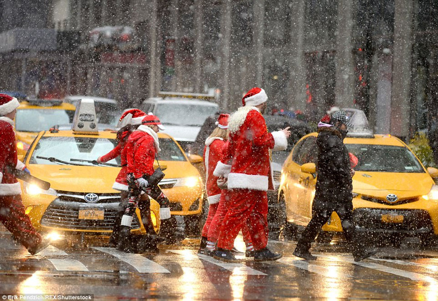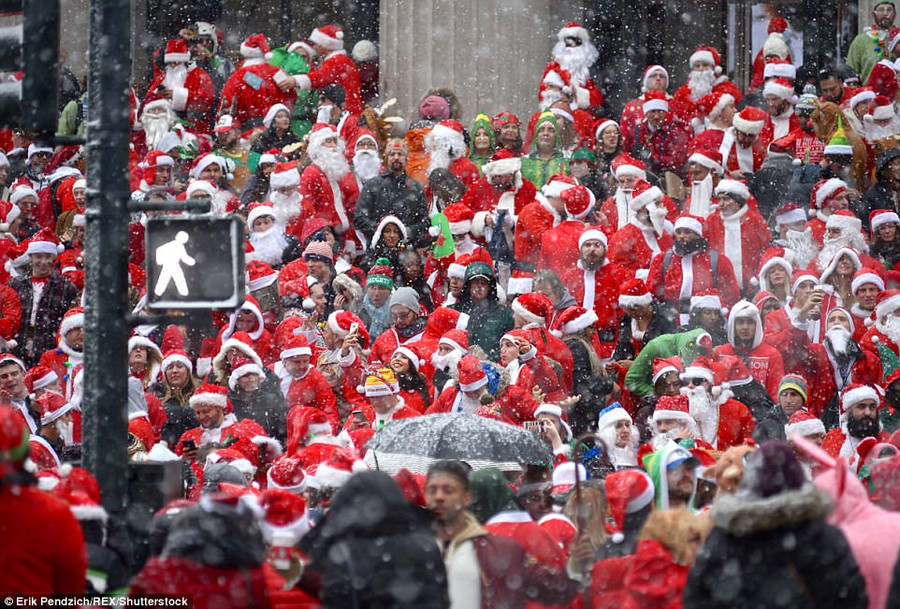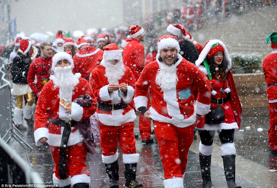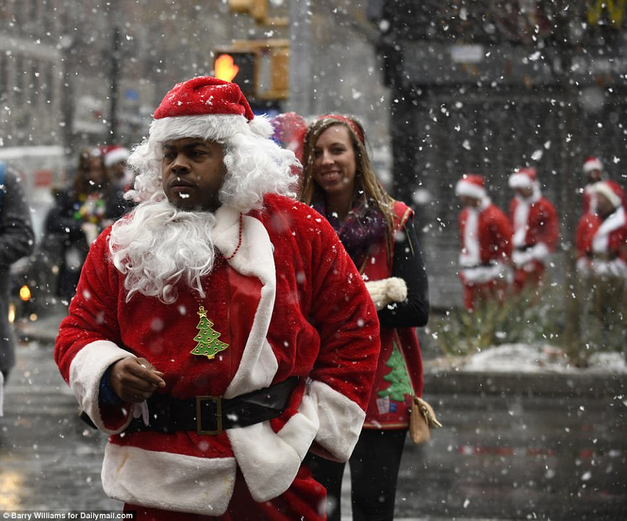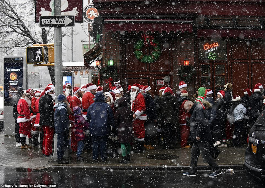 Cho dù được cơ quan khí tượng cảnh báo tuyết rơi dày đặc thêm nhưng hàng người vẫn mặc trang phục ông già tuyết để xuống đường vui vẻ.