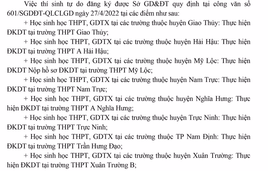 Về việc đăng kí bổ sung cho thí sinh tự do chưa thực hiện việc đăng ký trên Hệ thống phần mềm của Bộ GD&ĐT, Sở GD&ĐT Nam Định đã ban hành công văn về việc hướng dẫn công tác tuyển sinh đại học; tuyển sinh cao đẳng ngành Giáo dục Mầm non.