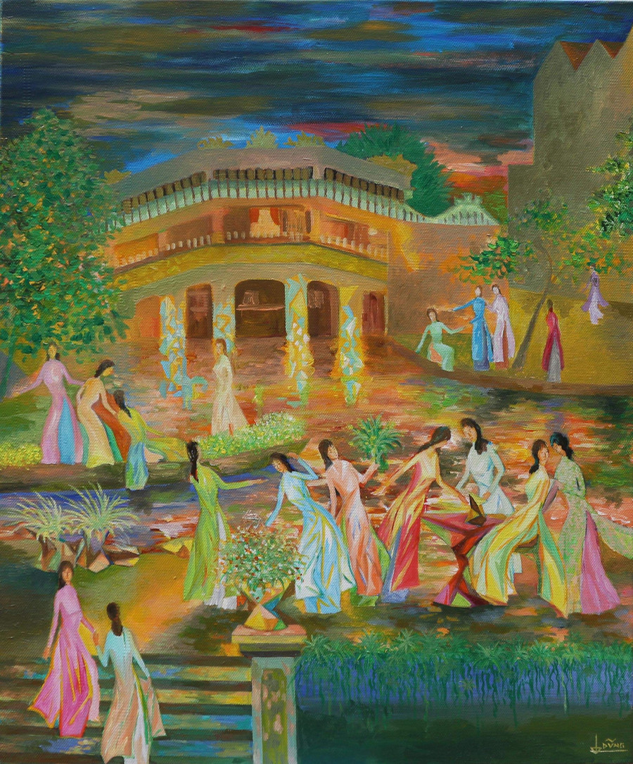 | Vẻ đẹp phụ nữ Việt với tà áo dài luôn là đề tài độc đáo của hội họa Việt. |