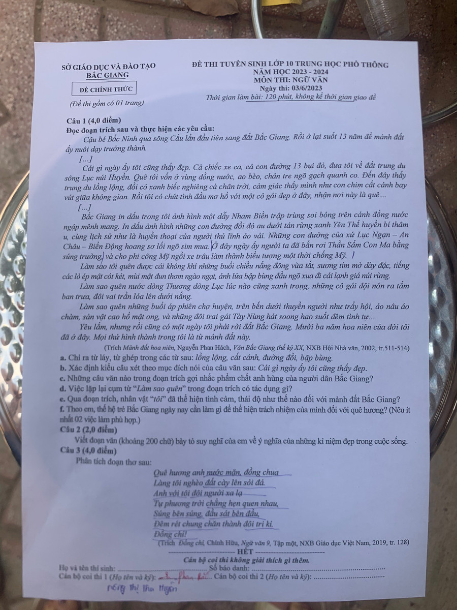 Đề thi Văn gồm 2 câu: Câu 1 (4 điểm), Câu 2 (2 điểm) và Câu 3 (4 điểm). Đặc biệt, Câu 1 có trích đoạn "Mảnh đất hoa niên" của tác giả Nguyễn Phan Hách với những giá trị truyền thông, nét đẹp quê hương Bắc Giang.