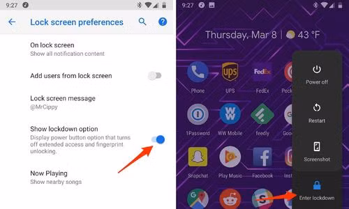 Với Android P, điểm bảo mật mới mà bạn có thể nhận ra là tính năng lockdown. Khi kích hoạt nó, điện thoại sẽ tắt cảm biến vân tay và người dùng buộc phải mở bằng passcode, mật khẩu hay hình vẽ...