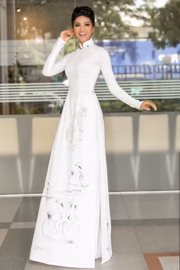 Nếu như ở những lần xuất hiện trước, Hoa hậu H’Hen Niê chọn trang phục có xu hướng tôn dáng gợi cảm, nhưng thời gian gần đây người đẹp quyết định mặc áo dài truyền thống cho một chủ đề liên quan đến người phụ nữ Việt Nam.
