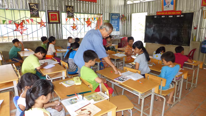 Gọi là lớp học chứ trước kia, nơi đây chỉ là một cái lều nhỏ chừng 20m2 được dựng lên từ những cây gỗ tạp lợp bằng các tấm tôn cũ kỹ, bao quanh là những tấm bạt ni lông hổng trước, thiếu sau để giúp các cháu tránh mưa, tránh nắng. “Việc vận động các cháu ra lớp rất vất vả vì cuộc sống của gia đình các cháu đều khó khăn, nhà xa, đi lại vất vả, tiếng Việt còn không rành”, ông Bích cho biết. Lớp học mới đầu chỉ có 3, 4 cháu, nhưng chỉ sau một thời gian kiên trì, đi từng nhà vận động, đã dần đông lên. Đến nay, lớp có hơn 30 học sinh từ lớp 1 đến lớp 5 đang theo học thường xuyên.