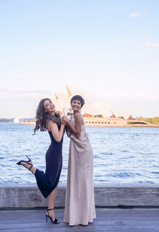 2 nàng hậu rất hạnh phúc, ôm nhau sau nhiều tháng không gặp. Miss Universe Australia không ngớt lời khen ngợi sắc vóc của H"Hen Niê khi chứng kiến sự rạng rỡ của cô gái đánh bại nhiều mỹ nhân lọt Top 5 tại đấu trường sắc đẹp lớn nhất hành tinh vào năm 2018.