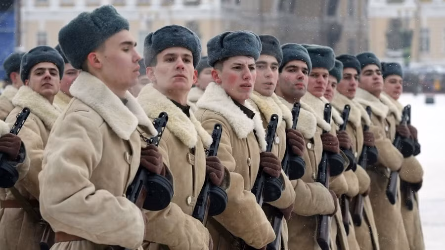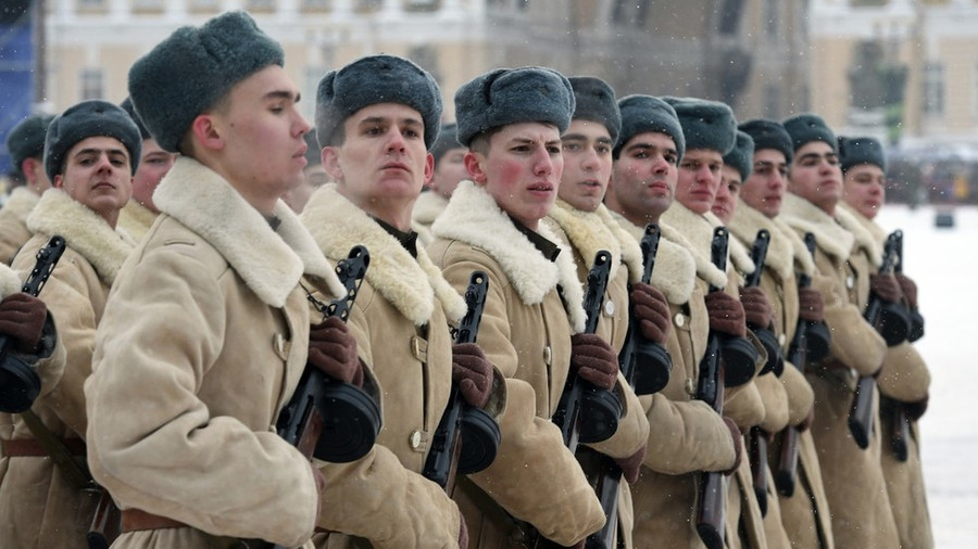 Mở màn cuộc diễu binh, binh sĩ từ lực lượng bộ binh, hải quân, không lực đã diễu hành qua Quảng trường Cung điện, trong đó có cả binh sĩ mang đồng phục của Hồng quân.