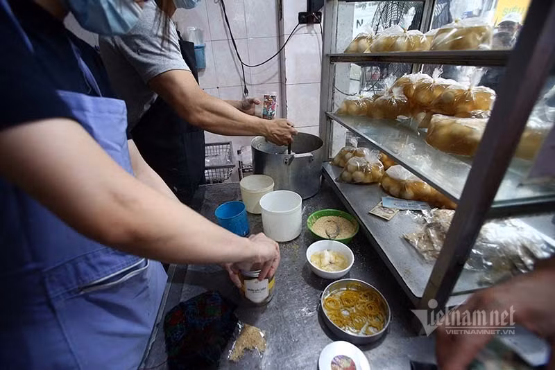 | Bên trong cửa hàng, nhân viên làm việc hết công suất, tay thoăn thoắt múc bánh cho vào hộp cho khách. |