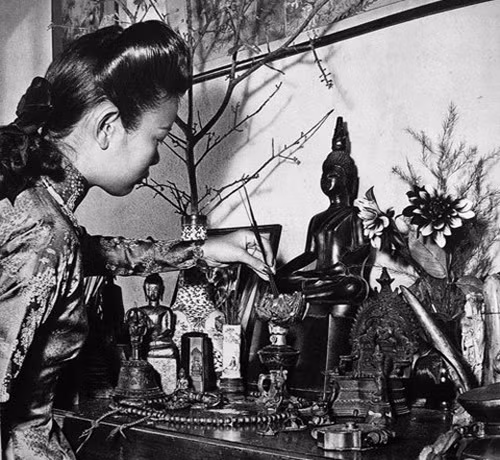 Một gia đình đang sửa soạn bàn thờ gia tiên ngày Tết.