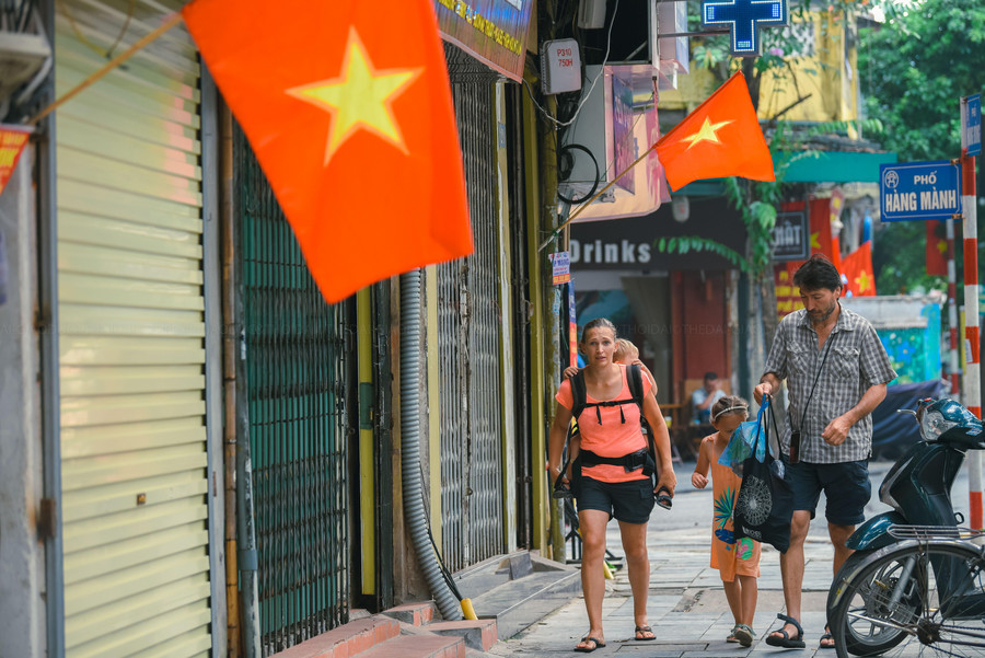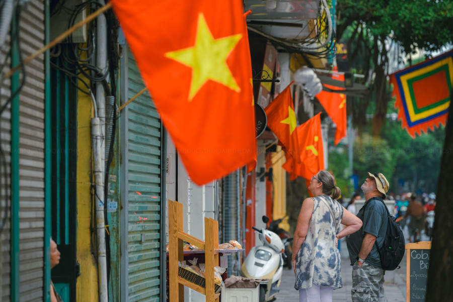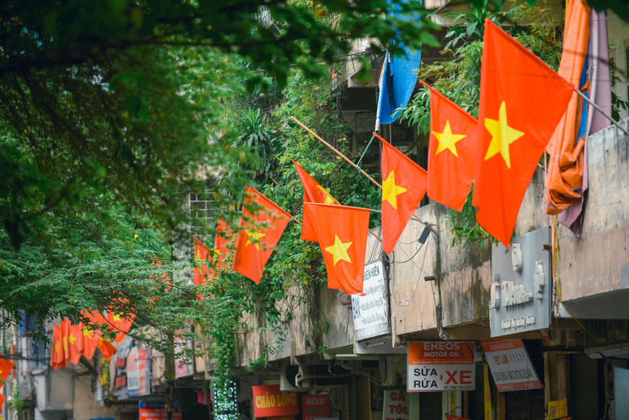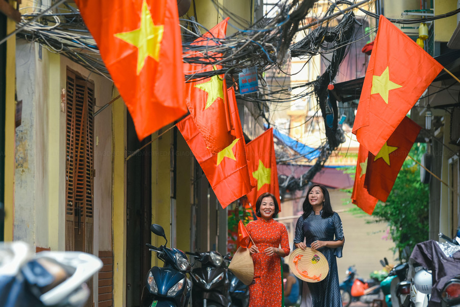 | Hà Nội rực rỡ cờ đỏ sao vàng, pano, khẩu hiệu... được trang hoàng trên khắp các tuyến phố. |