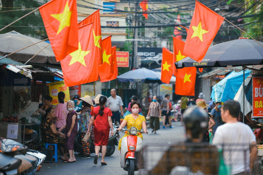Khắp phố phường của Thủ đô Hà Nội đều được trang hoàng rực rỡ bằng cờ, hoa, băng rôn, áp phích... chào mừng 77 năm Quốc khánh nước Cộng hòa xã hội chủ nghĩa Việt Nam (2-9-1945 / 2-9-2022).