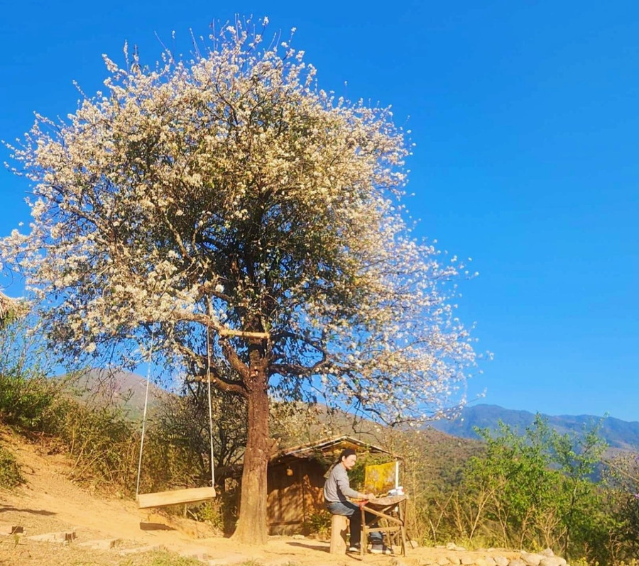 | Vẻ đẹp của những nếp nhà nằm lấp ló giữa rừng hoa Sơn Tra. |