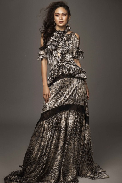 Trái ngược với Á hậu Hoàng Thuỳ, Á Hậu Mâu Thuỷ lại “lộ diện” trong sự dịu dàng, đằm thắm đầy quyến rũ.