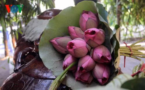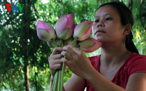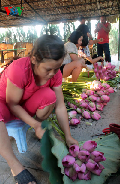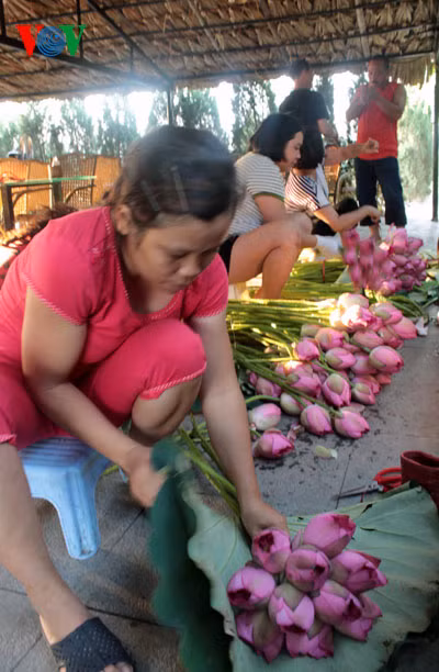 Sen đầu mùa và sen nở vào sáng sớm hương thơm nồng đượm hơn. Người ta đi thuyền trên đầm hái những bông hoa sen chum chím nở rồi chuyển lên chòi để mấy chị bó thành chục giao cho khách.