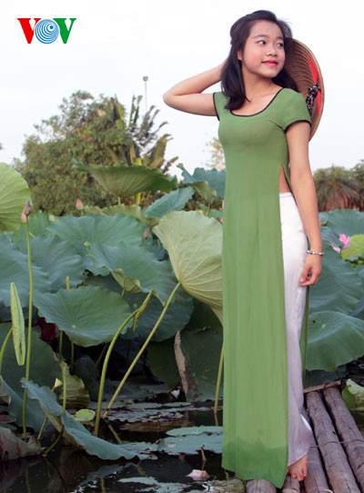 | Thiếu nữ tạo dáng bên hồ sen. |