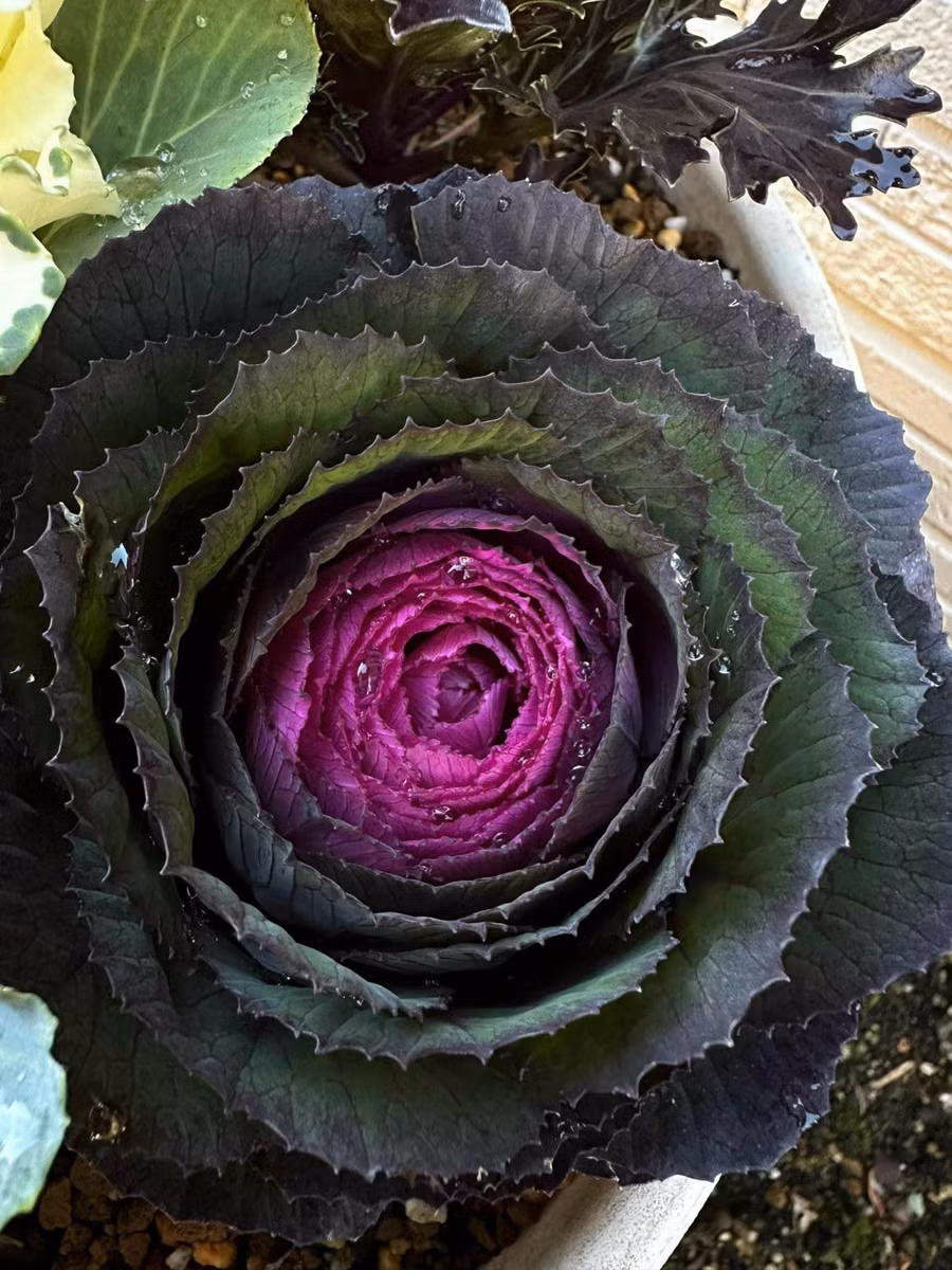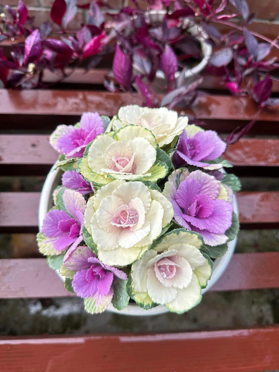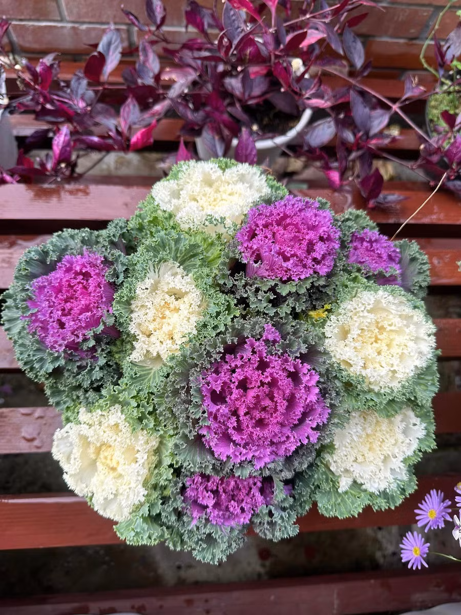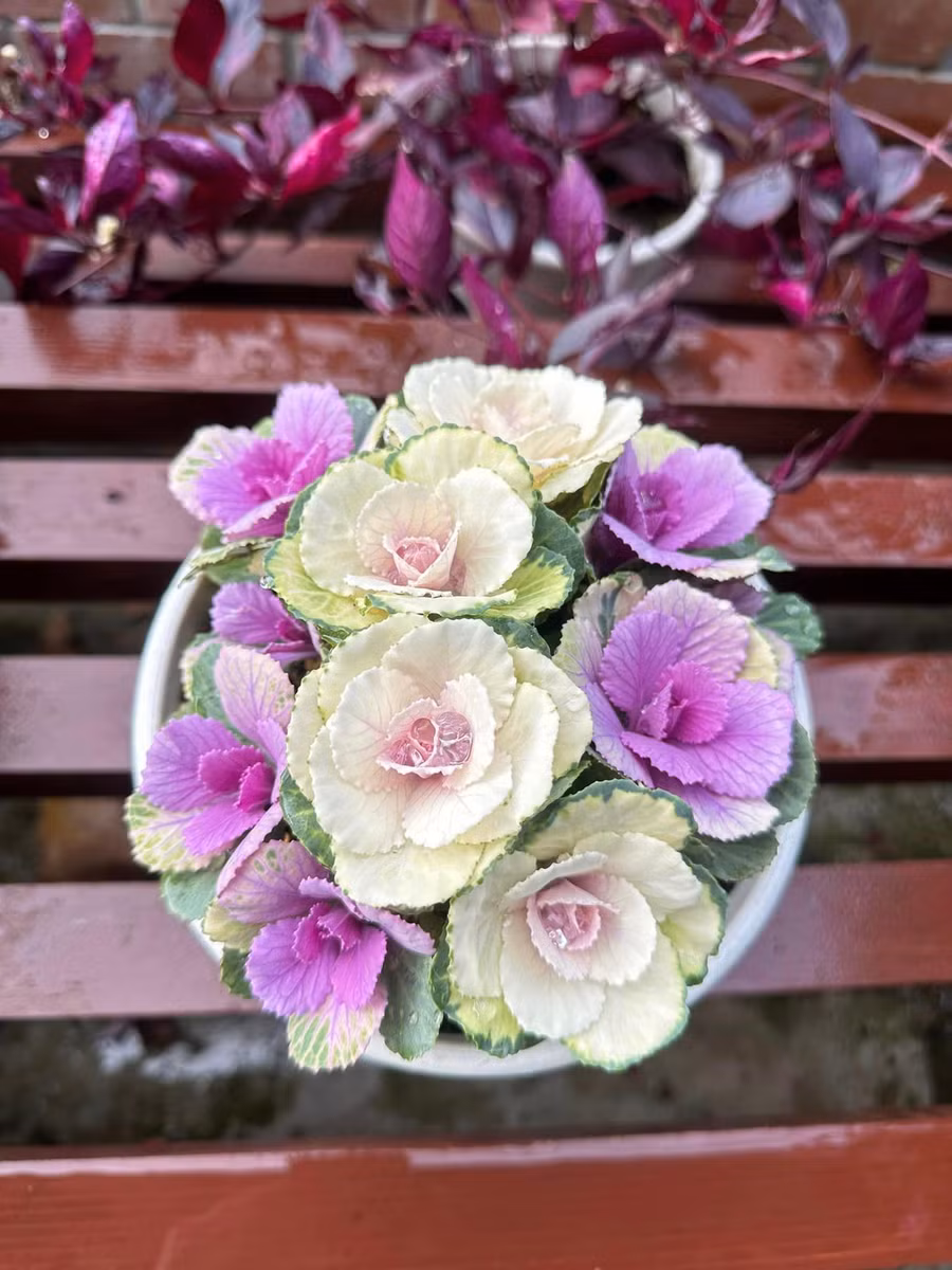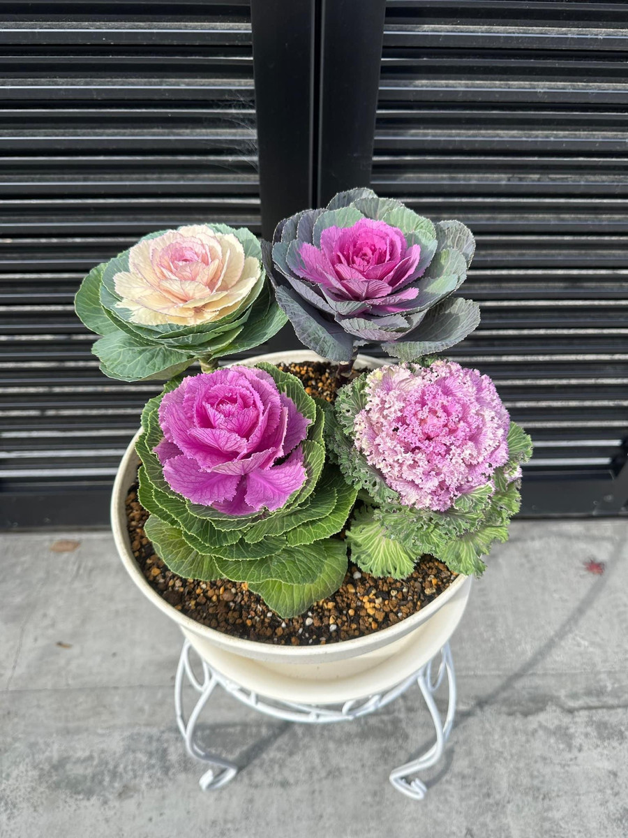 Hoa bắp cải nhiều màu hay còn gọi bằng cái tên mỹ miều là Hoa Hồng Sa Mạc. Nhìn hình dáng bên ngoài, chúng không khác gì so với loại bắp cải thông thường. Đặc biệt ở mỗi 1 bông hoa đều được tạo nên bởi những chiếc lá nhiều màu với màu tím nhạt hoặc trắng bên trong và được bao bọc bởi những lá xanh bên ngoài đan xen xếp thành vòng cung vô cùng rực rỡ bắt mắt. Từ đó tạo nên sức hút kì lạ với những người yêu thích chúng.