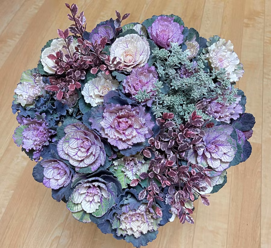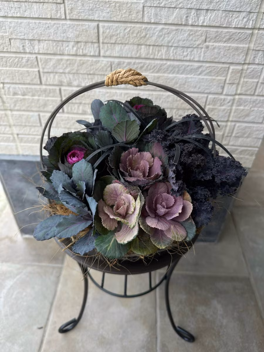 | Bạn có thể mua chậu hoa hình tròn bán sẵn kiểu tre đan, lưới như bao tải lót xuống cho đất và xếp hoa bắp cải loại size nhỏ. |
