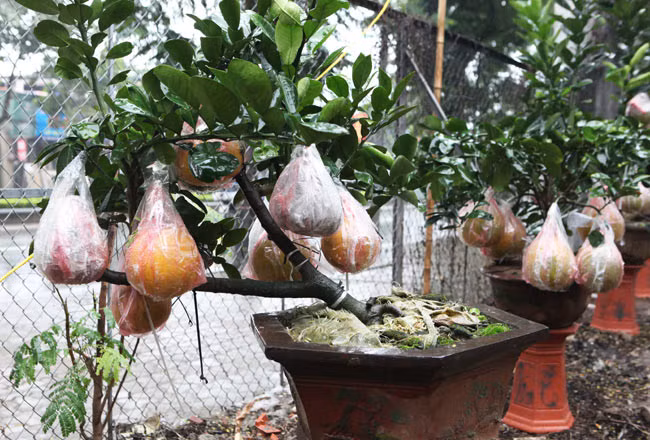 Vườn bưởi "khủng" này thuộc sở hữu của anh Nguyễn Kim Thắng (thôn 6, Song Phương, Hoài Đức, Hà Nội). Hiện, những cây bưởi cảnh anh trồng đang được bày bán trên đường Lạc Long Quân (quận Tây Hồ, Hà Nội) phục vụ người dân chơi dịp Tết Âm lịch.