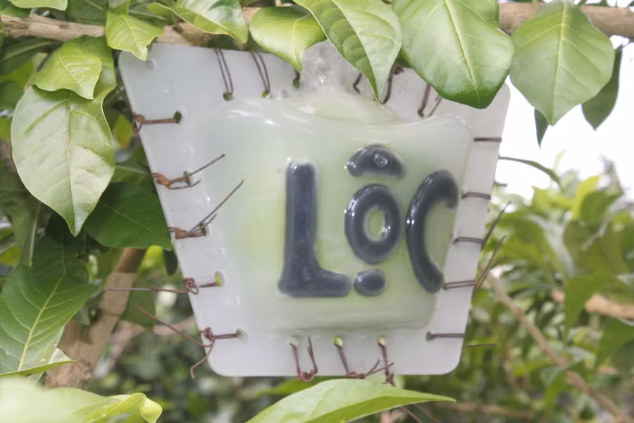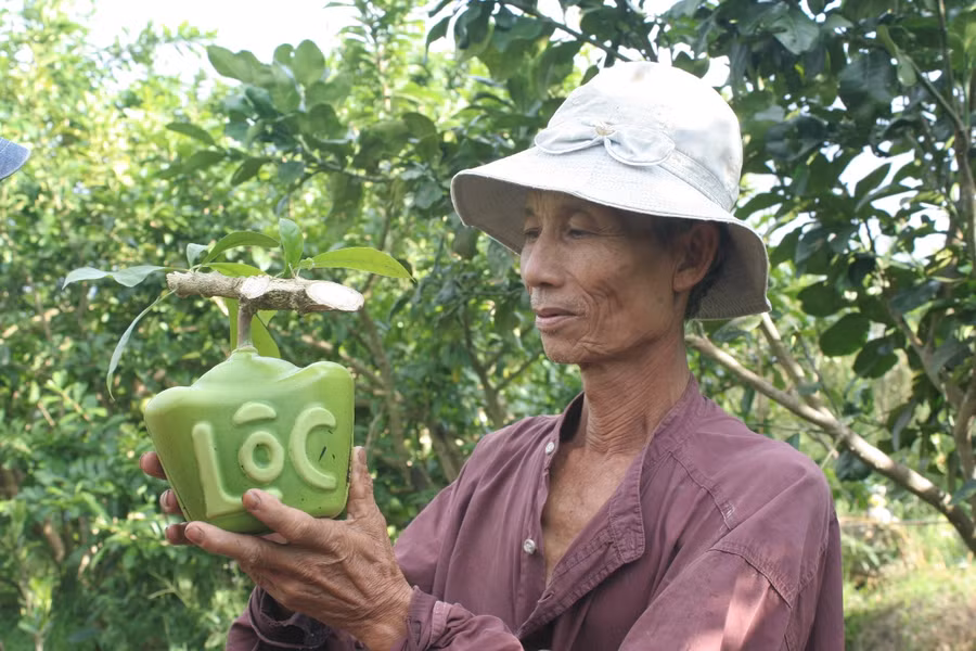 Tạo hình thành công đào tiên hình thỏi vàng có in chữ Tài - Lộc, anh Võ Nguyên Tín, cùng ở ấp Phú Trí A dự kiến cung ứng ra thị trường Tết khoảng 200 trái, giá khoảng 1,5 triệu đồng/cặp…
